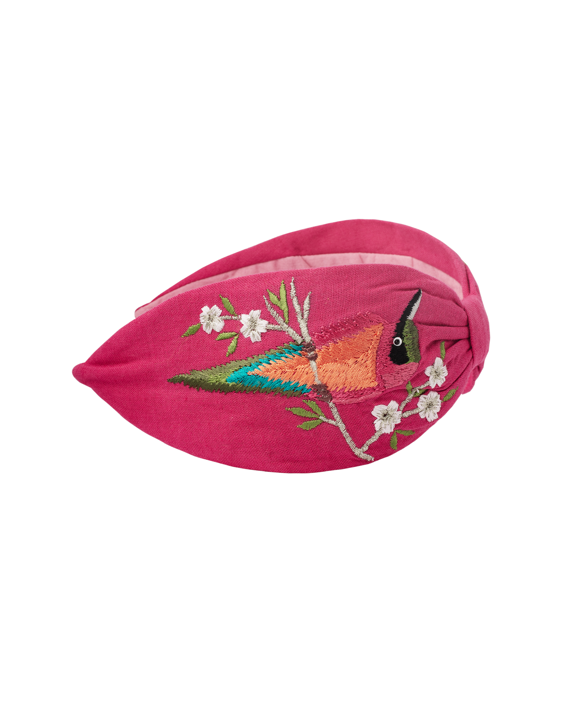 Deep pink headband with a hand-embroidered bird perched on a branch, surrounded by delicate flowers.