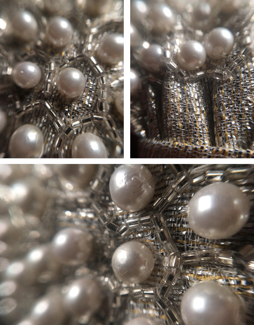 Hand-embellished with pearls over a delicate sequin net base.