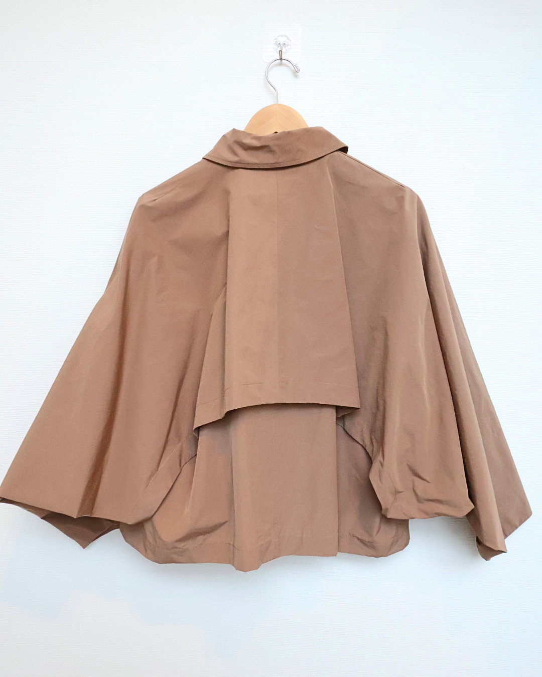 A cropped trench silhouette with dramatic batwing sleeves, blending classic tailoring with contemporary shape. Made in Italy.