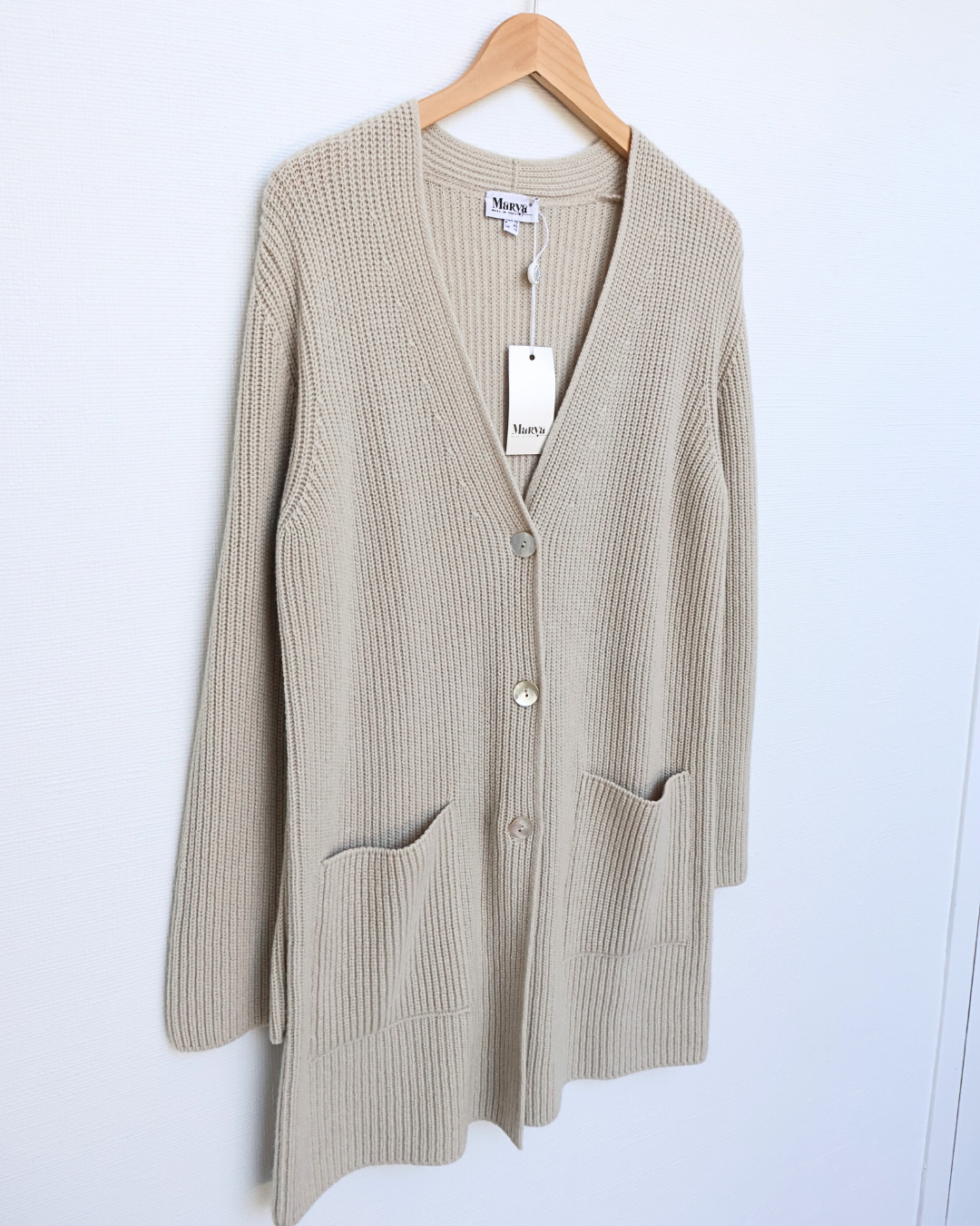 A longline ribbed cardigan with a deep V-neck, shell buttons, and functional pockets. Designed for ease, elegance, and effortless layering.