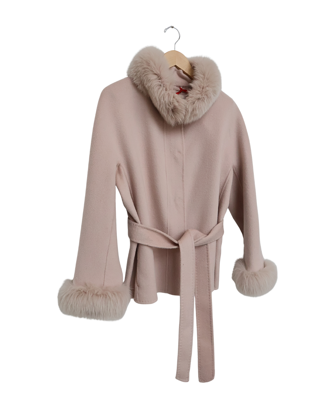 An Italian-made statement coat crafted from wool zibeline, finished with fox fur sleeves and collar in a soft blush tone.