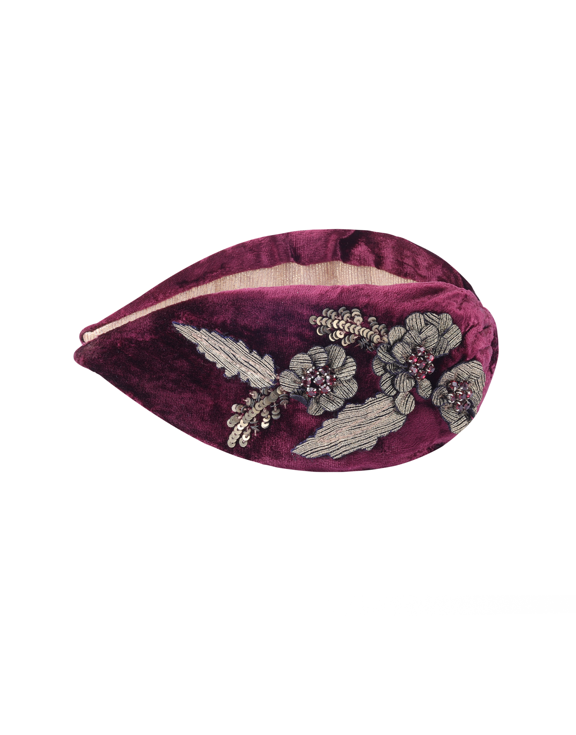 Wine red velvet headband, embellished with silver embroidered floral details and sequin accents for a rich, regal finish.