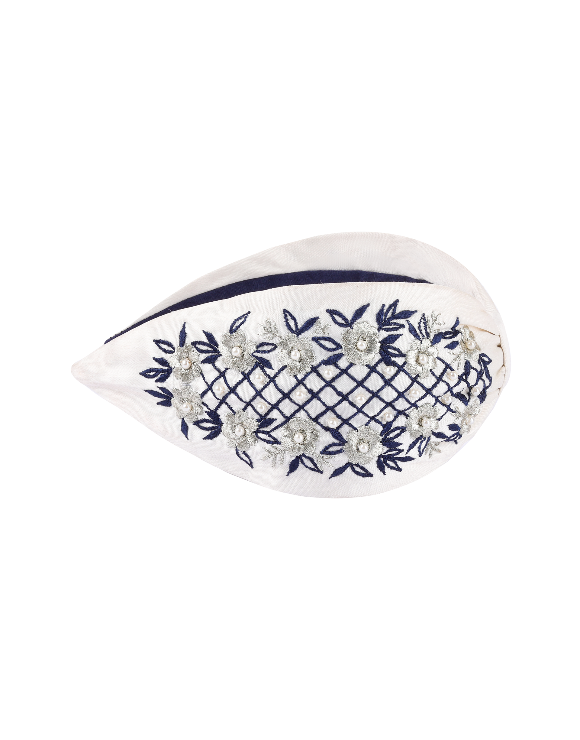 White headband with silver embroidered flowers, navy embroidery, and hand-beaded pearl accents.