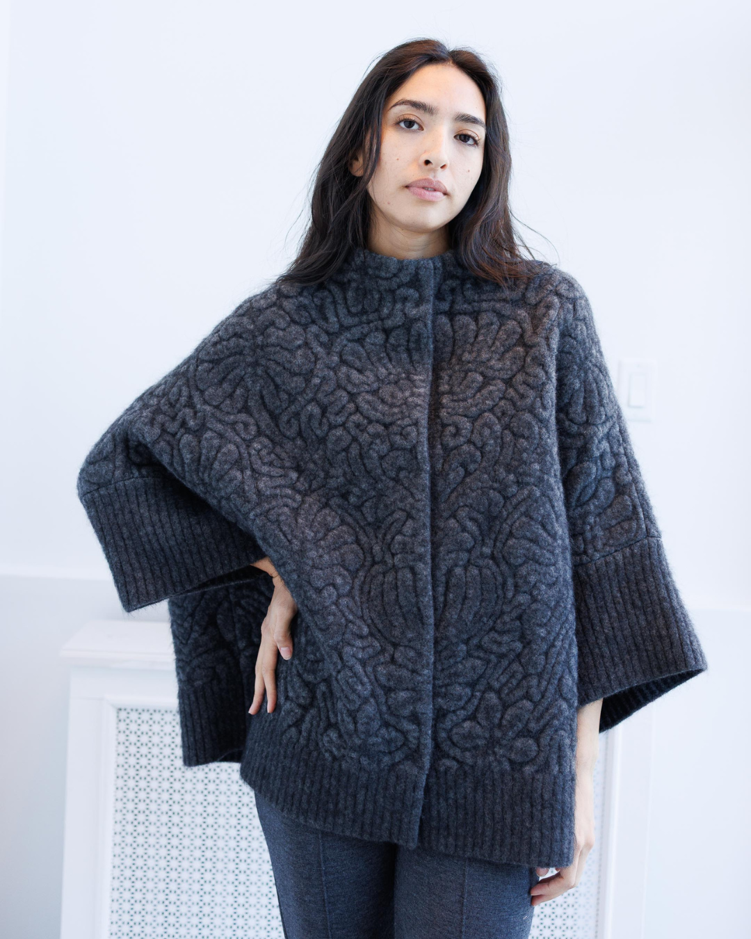 A charcoal-toned printed knit jacket with batwing sleeves and mock neck, combining comfort with modern structure. Made in Italy.