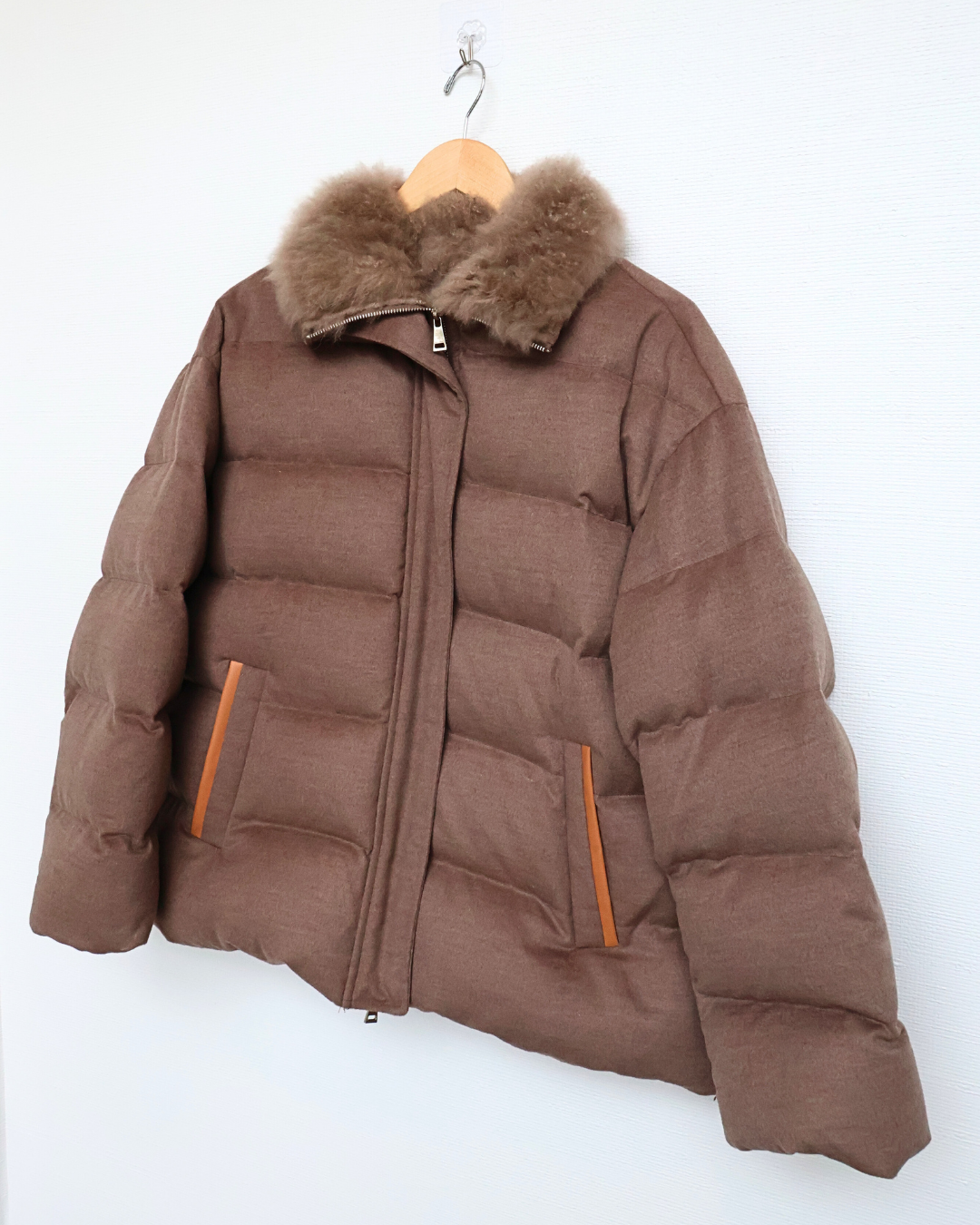 A sophisticated taupe quilted jacket made in Italy, featuring a soft cashmere goat fur collar for warmth and refined detail.
