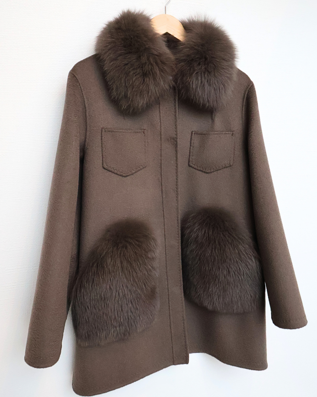 Taupe Shirt Jacket with Fox Fur Pockets & Collar | Medium Length | Size 42