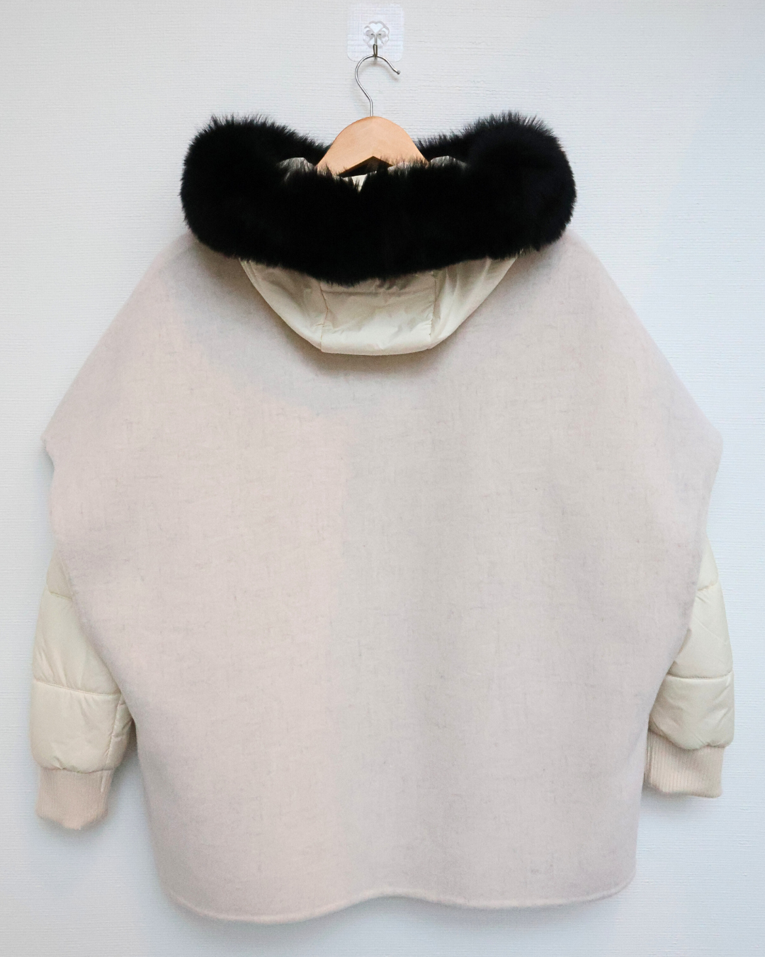 A statement Italian-made puffer featuring a cashmere cape overlay and black mink fur trim, designed for warmth with elevated contrast and texture.